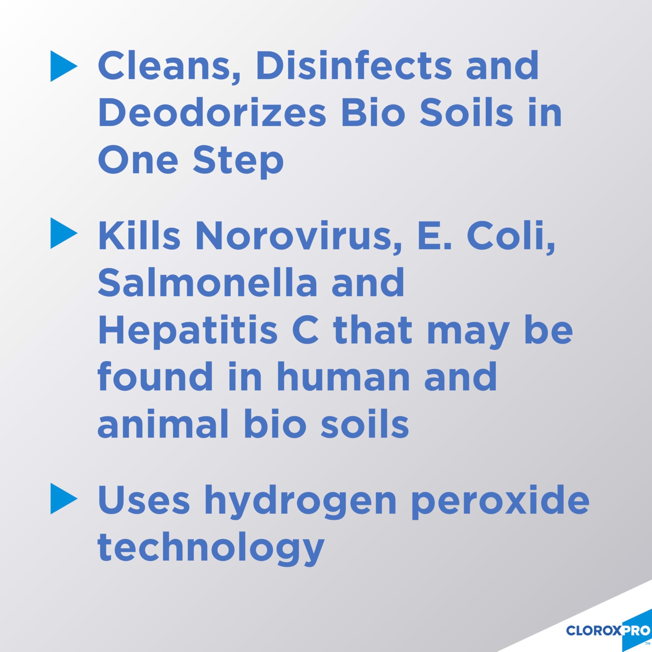 - DISINFECTING PULL TOP: Clean and disinfect with CloroxPro Disinfecting Bio Stain & Odor Remover; kills Norovirus, E. coli, Salmonella and Staphylococcus aureus (Staph); packaging may vary